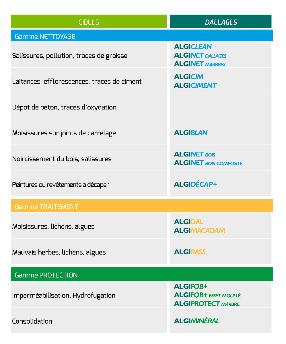 Pour une terrasse d’environ 25 m², les produits préconisés sont : ALGINET DALLAGES en nettoyant, ALGIDAL ou ALGIMOUSS en traitement, pour finir avec un minéralisant si votre dallage à subit l’érosion de la pluie, ALGIMINERAL et une protection comme ALGIFOB+.